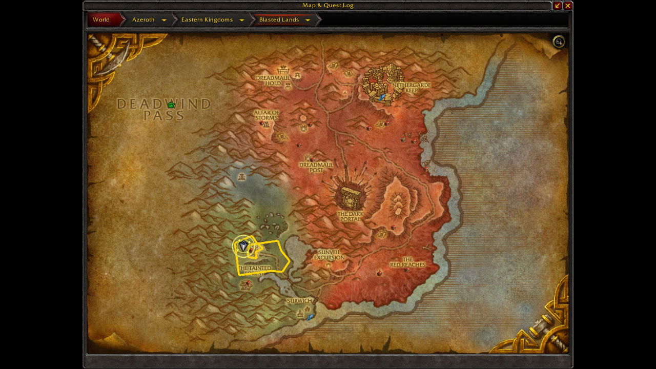 You will be killing the Doomguard Destroyers and Dreadlord Defilers in the Tainted Forest of the Blasted Lands. Other drops among the Imperfect Draenthyst Fragments are around 50-70 Felcloth per Hour and a very slim chance of the Skullflame Shield along with other transmog items what can also be obtained from Kum’isha’s Junk.