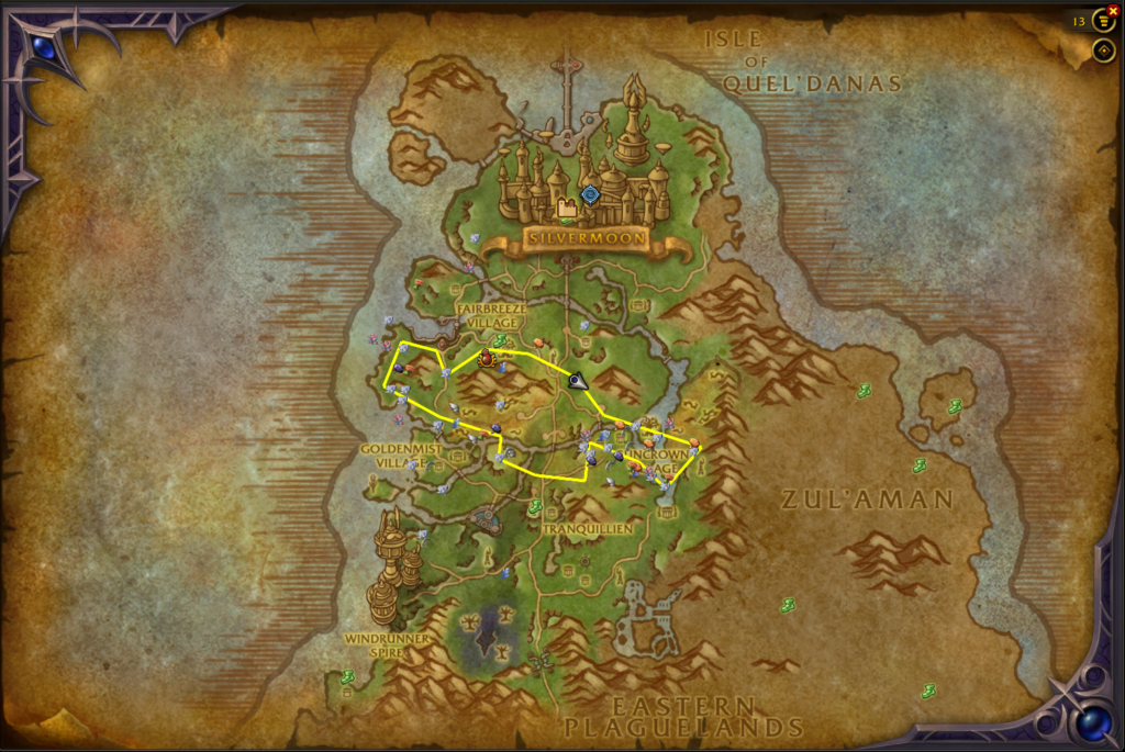 In this guide I show a smooth gathering loop around Silvermoon City that runs along the outer perimeter of the zone. This route allows you to collect herbs and ore while avoiding heavy mob areas and crowded farming paths.
